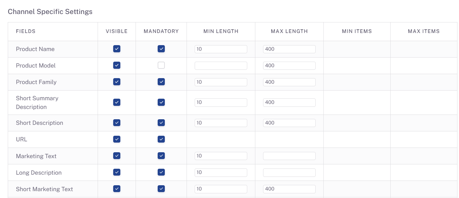 ➜ Added validations for product content export for each field (product descriptions’ character length, bullet points’ forbidden words, image count)New validation settings have been introduced to improve the quality and consistency of product content exported to your channels. These include field-level controls for visibility, mandatory status, minimum and maximum character limits, and the number of items. Moreover, bullet points are now validated to ensure they start with a capital letter, do not end with a period, and contain no special characters or emojis. You can also define banned words per language (e.g., “speed”, “security”, “performance”) to avoid non-compliant content.