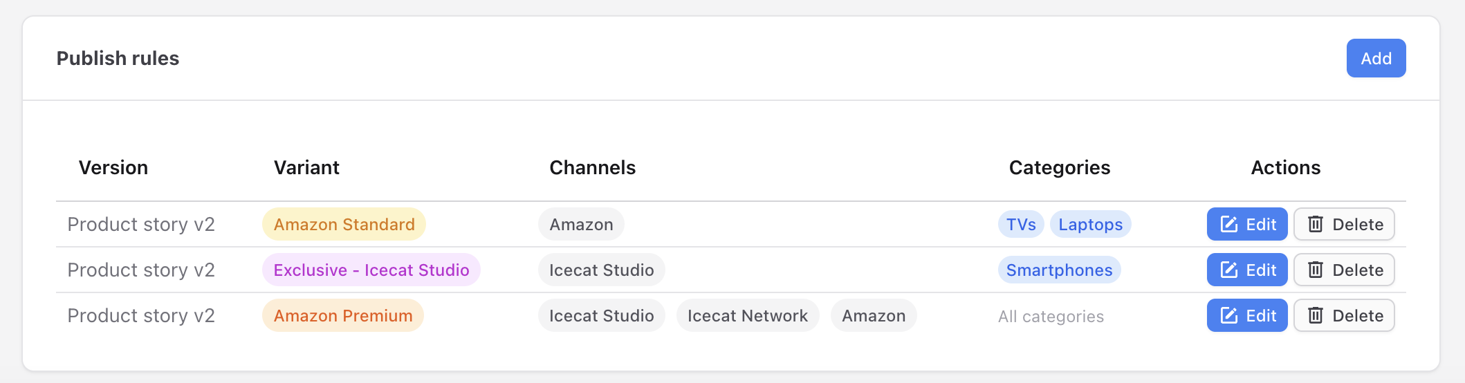 We introduced category-level publication rules within a brand, enabling more granular control over how Product Story variants are distributed.